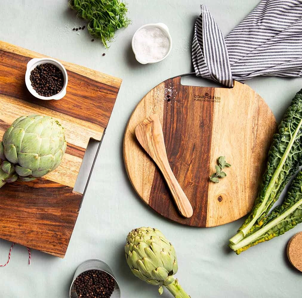 Solide en betrouwbaar, de Bowls and Dishes Pure Rose Wood serveerplank voorziet uw gerechten van een sterke ondergrond en opvallende presentatie. De plank is voorzien van 1 metalen handgreep en is vervaardigd uit Indian Rosewood, afkomstig van Dalbergia Sissoo bomen uit Zuid-Azië. De plank heeft een diameter van 50 cm en een hoogte van 2 cm. Gebruik de Bowls and Dishes Pure Rose Wood plank voor het opdienen of presenteren van gerechten.
