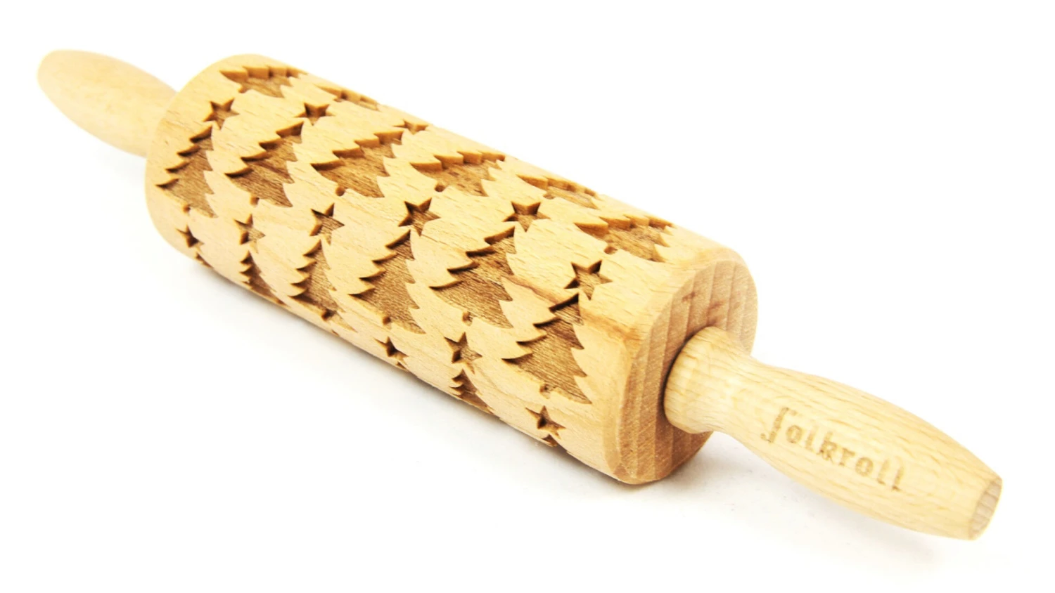 De Folkroll Junior-deegroller met het patroon Christmas Tree is vervaardigd uit beukenhout. Het bedrukte deel van de deegroller is 11,5 cm lang, en heeft een diameter van 4,5 cm. De gehele deegroller heeft een lengte van 23 cm. Gebruik de Folkroll-deegroller voor het decoreren van koekjesdeeg, chocolade, suiker, marsepein, zout, keramiek of kleiproducten.
