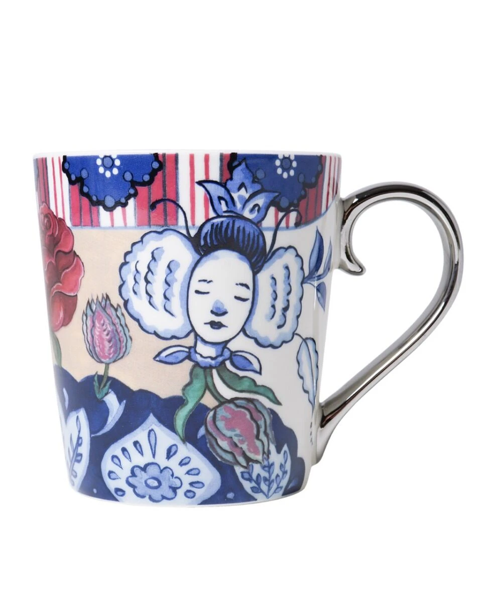 De Heinen Delfts Blauw The Heritage theemok is gemaakt van hoogwaardig porselein en heeft een inhoud van 300 milliliter. De theemok is voorzien van een print geïnspireerd op traditionele klederdracht en de roos als symbool van gemeenschap en huwelijk en is ontworpen door Pepijn van den Nieuwendijk.