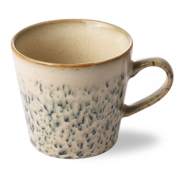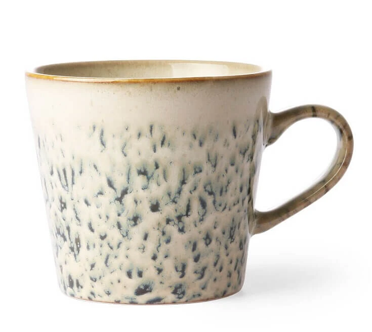 De HK Living 70’s cappuccinomok is gemaakt van crème met gestippeld groen geglazuurd aardewerk. De mok heeft een diameter van 9,5 cm en is 8,5 cm hoog, de inhoud bedraagt 300 ml.