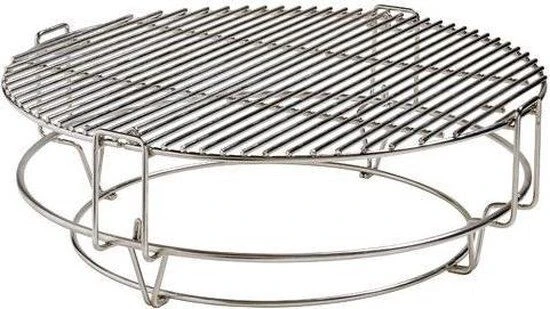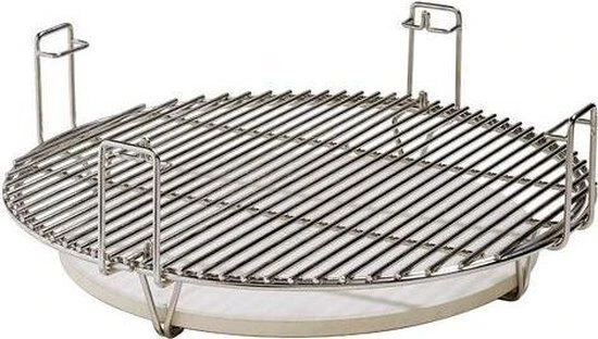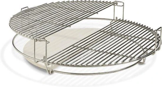 Het Keij divide and conquer grillrek is geschikt voor gebruik op 21 inch Kamado’s. De verpakking bestaat uit 1 divide and conquer frame, 2 roestvrij stalen half moon grillrekken, 2 half moon keramieken deflector platen en 1 accessoire ring waar een dutch oven in kan worden gehangen of een wok op kan worden gezet. Dit rek kunt u perfect gebruiken om gelijktijdig direct en indirect te grillen. Bovendien verdubbelt u met deze set eenvoudig het grilloppervlak.