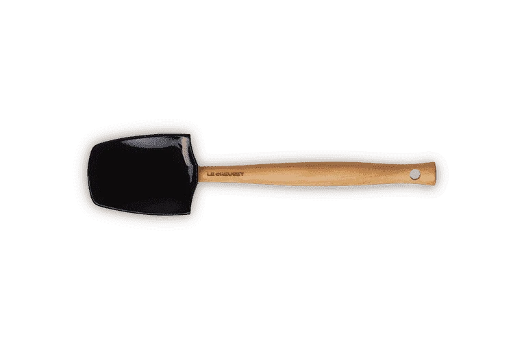 De zwarte Le Creuset grote spatel is gemaakt van hout en heeft een siliconen blad, waardoor de spatel niet krast. De spatel heeft een platte en bolle zijde en heeft een lengte van 28 cm. De breedte van het blad is 7 cm.