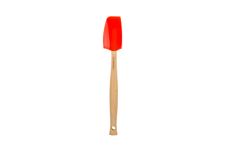 De vulcanique Le Creuset kleine spatel is gemaakt van hout en heeft een siliconen blad, waardoor de spatel niet krast. De spatel heeft een platte en bolle zijde en heeft een lengte van 28 cm. De breedte van het blad is 4,5 cm.