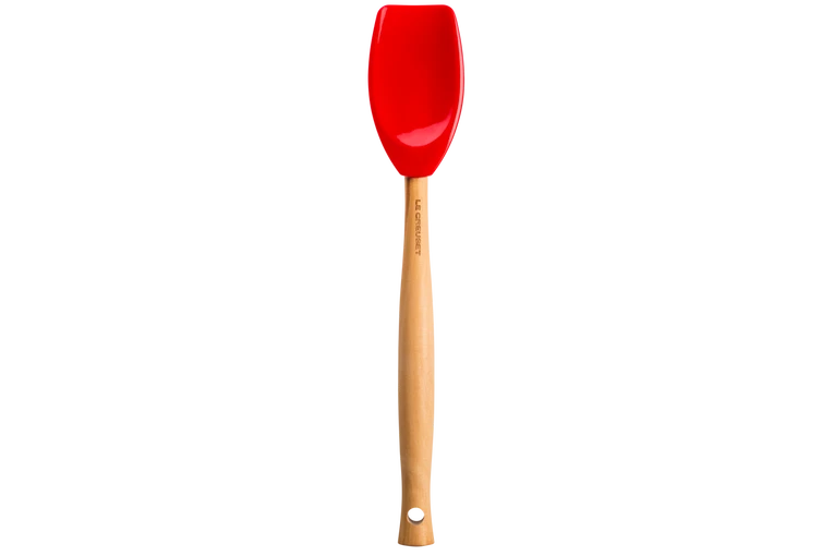 De Le Creuset Premium lepelspatel is gemaakt van hout en heeft een kersrode siliconen blad, waardoor de spatel niet krast. De spatel heeft een bolle en een holle zijde en is 29 cm lang.