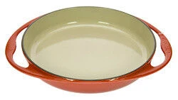De rode tarte tatinvorm van Le Creuset heeft een diameter van 28 cm en een inhoud van 2,7 liter. Met de tarte tatinvorm van gietijzer bereidt u appel en peren tarte tatins.