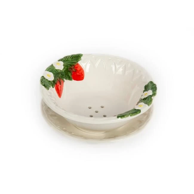 De Oldenhof fruittest is gemaakt van aardewerk en bestaat uit een schaaltje met gaatjes (17,5 cm) en een onderbord met een diameter van 22 cm. De fruittest is versierd met schilderingen van aardbeien. Gebruik de set voor het wassen, laten uitlekken en het serveren van vers fruit.