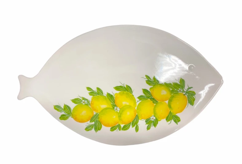 De Oldenhof citroen XXL presenteerschaal is gemaakt van aardewerk in de vorm van een vis met versiersels van citroenen. De schaal is wit en heeft een lengte van 47 cm met een breedte van 28 cm. Gebruik de schaal voor het opdienen van vis of andere gerechten.
