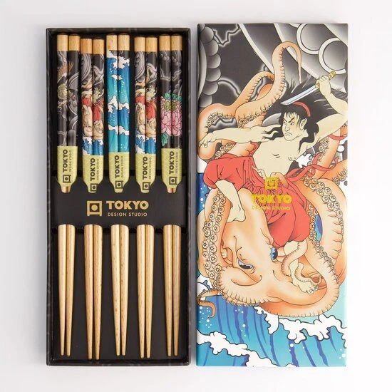 De Oldenhof eetstokjes zijn gemaakt van hout en zijn voorzien van een Yakuza-dessin. De stokjes hebben een lengte van 22,5 cm en komen in een luxe doosje met 5 sets van 2 eetstokjes. Gebruik de eetstokjes voor het eten van Aziatische gerechten als sushi of noedels.