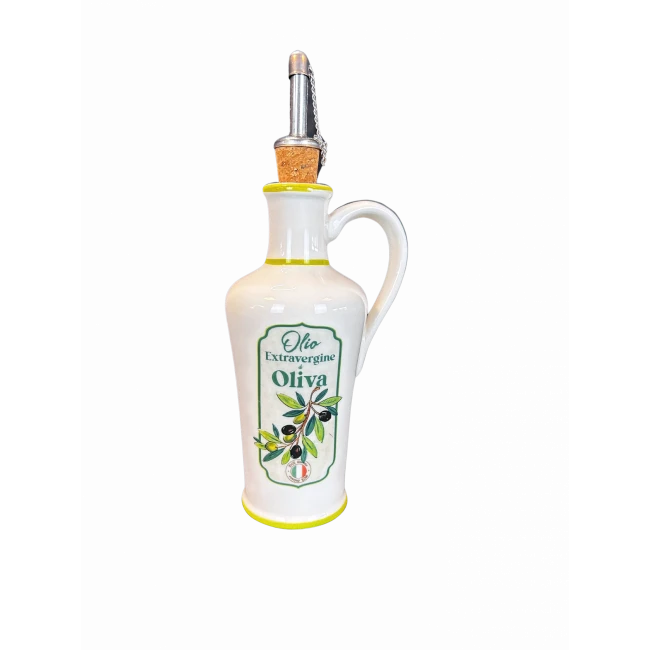 De Oldenhof olijfoliefles is gemaakt van wit aardewerk en is gedecoreerd met olijven en voorzien van een oortje. Gebruik de olijfoliefles voor het doseren en serveren van (olijf)olie.