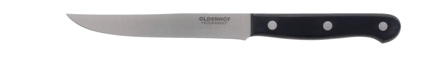Het Oldenhof Solo steakmes heeft een lemmet van messenstaal met een lengte van 12,5 cm. Het zwarte kunststof heft zit met klinknagels vast. De gladde snede zal de vezels van uw vlees doorsnijden in plaats van uit elkaar trekken.