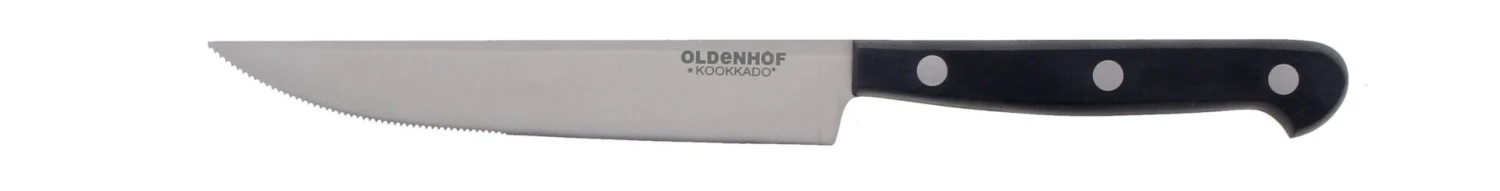 Het Oldenhof Solo steakmes heeft een gekarteld lemmet van messenstaal en een zwart kunststof heft. Het lemmet heeft een lengte van 13 cm, in totaal is het mes 23 cm lang.