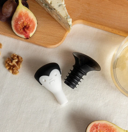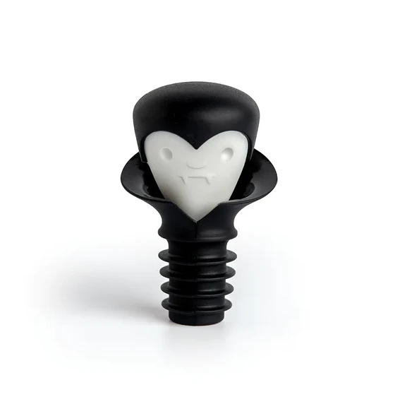 De Count Corkula wijnstop en -schenker van Ototo is gemaakt van zwart silicone. De stop heeft de vorm van een Dracula met een kraag als schenktuit. De wijnstop is 6 cm hoog en 4 cm breed. Sluit uw wijnflessen af met de stop en schenk uit met de tuit.
