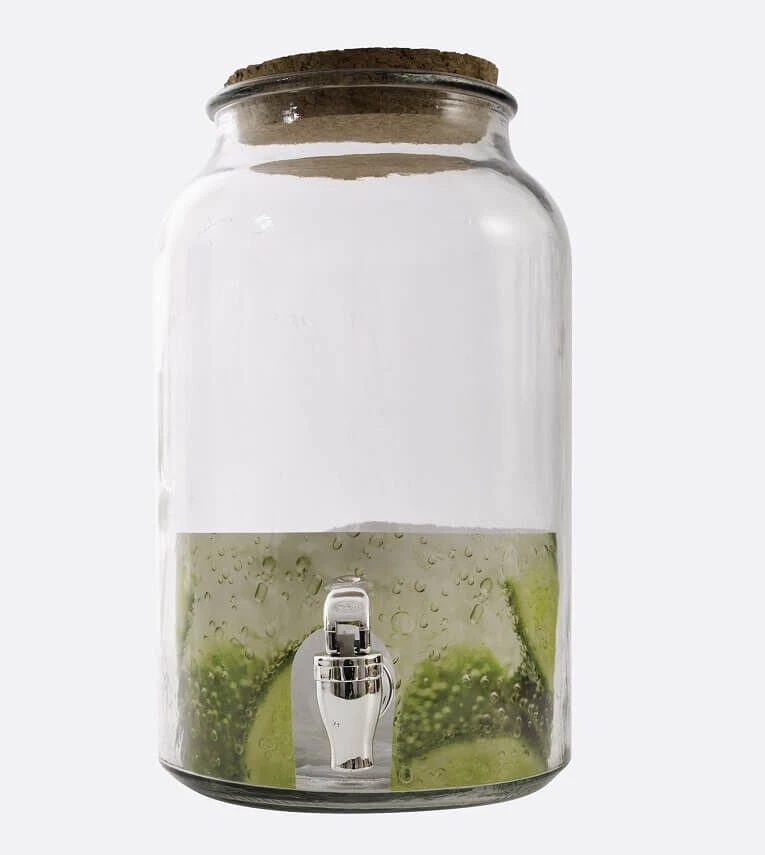 De Point-Virgule drankendispenser is vervaardigd uit glas en heeft een inhoud van 5,6 liter. De dispenser is voorzien van een tap, waardoor u de inhoud makkelijk in een glas laat lopen. Het kurkdeksel zorgt ervoor dat de dispenser afgesloten is van ongedierte en stof. Gebruik voor het bewaren van limonade en sap en het tappen hiervan in een glas.