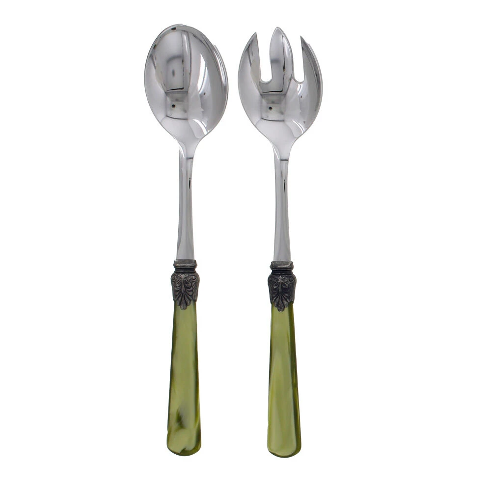 Het Rivadossi Sandro Elena slacouvert is gemaakt van roestvrij staal, met een heft van groen acryl. Het heft is voorzien van een decoratief element. Het slacouvert is tweedelig. Gebruik voor het opscheppen van salades en andere gerechten.