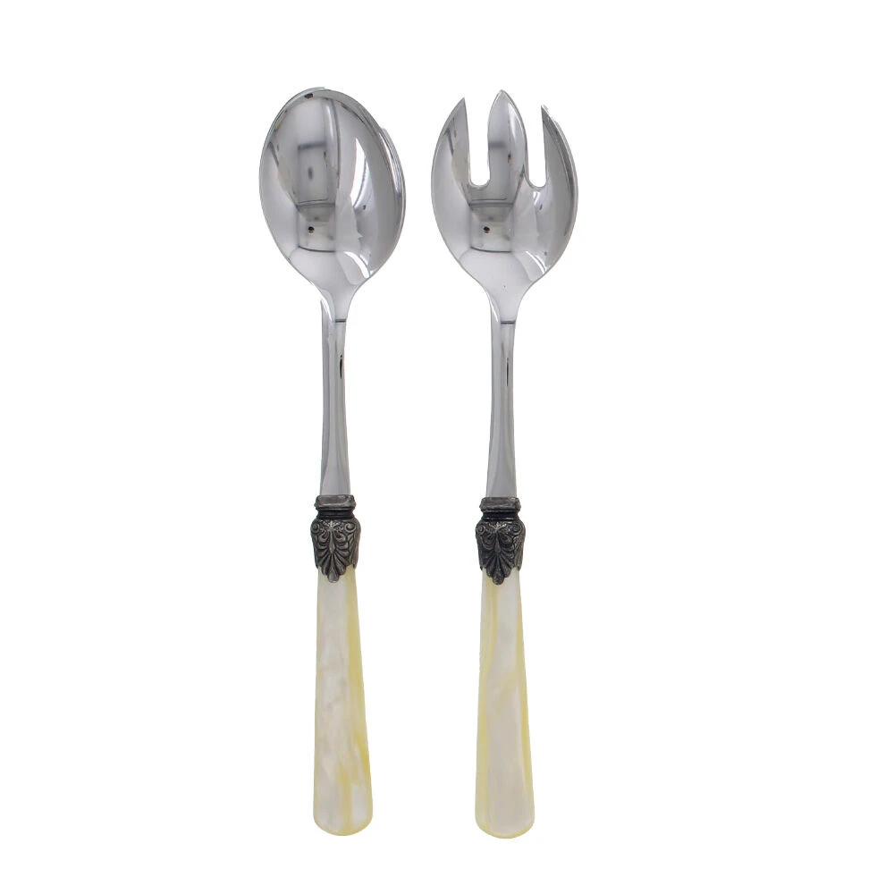 Het Rivadossi Sandro Elena slacouvert is gemaakt van roestvrij staal, met een heft van ivoor acryl. Het heft is voorzien van een decoratief element. Het slacouvert is tweedelig. Gebruik voor het opscheppen van salades en andere gerechten.