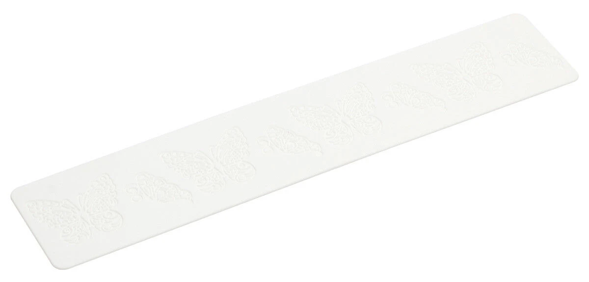 De Silikomart Tricot Butterfly silicone decoratiemat is 40 cm lang en 8 cm breed. Voorzie uw taarten, cupcakes of koekjes van decoratieve en smakelijke suikerlagen.