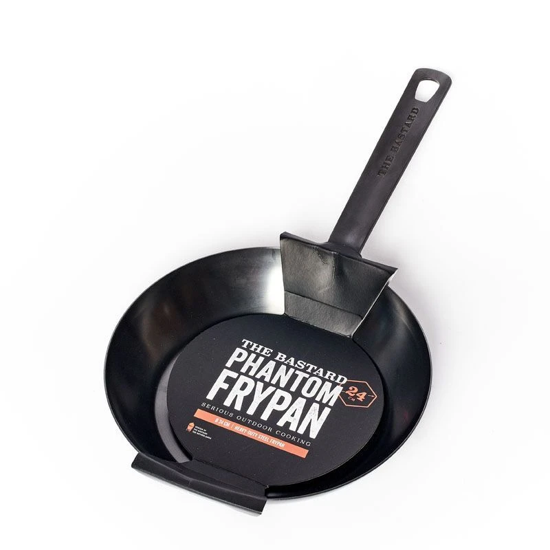 De The Bastard Phantom koekenpan heeft een diameter van 24 cm en is gemaakt van carbonstaal. Het oppervlak van de pan is genitreerd, het is sterk, roestvrij en gaat jaren mee. De Phantom pan is geschikt voor op hoog en direct vuur en heeft een anti-aanbakwerking. Gebruik de koekenpan voor het bakken van diverse ingrediënten op de barbecue.